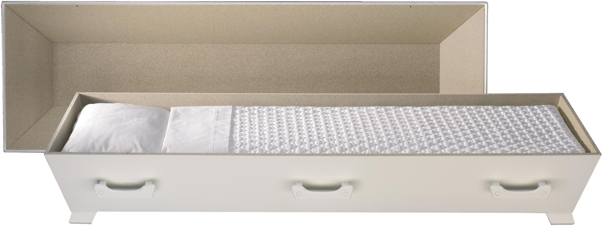 Enkel hvit kiste, tilvirket i sponplate. Modellen har en enkel innredning.