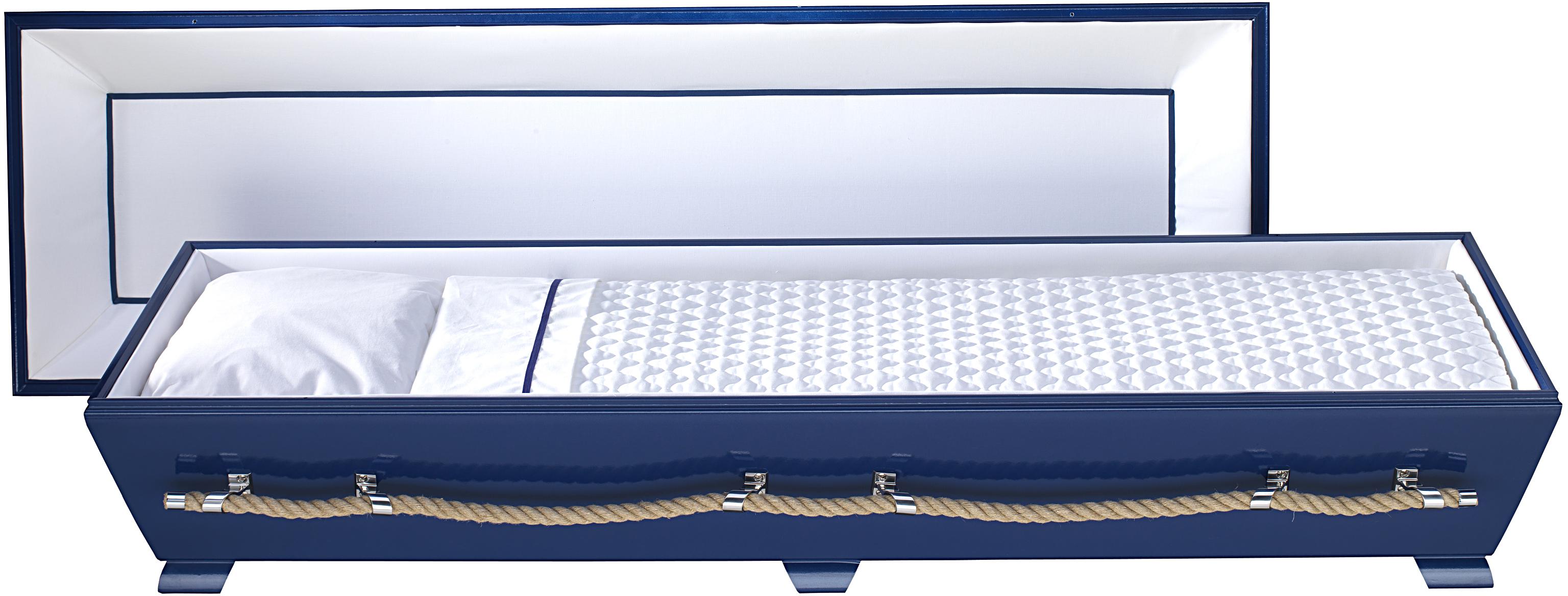 Løst lokk som skrues fast. Madrass, teppe og pute. Innredning i bomull. Dekorband i innredningen i kistens farge.