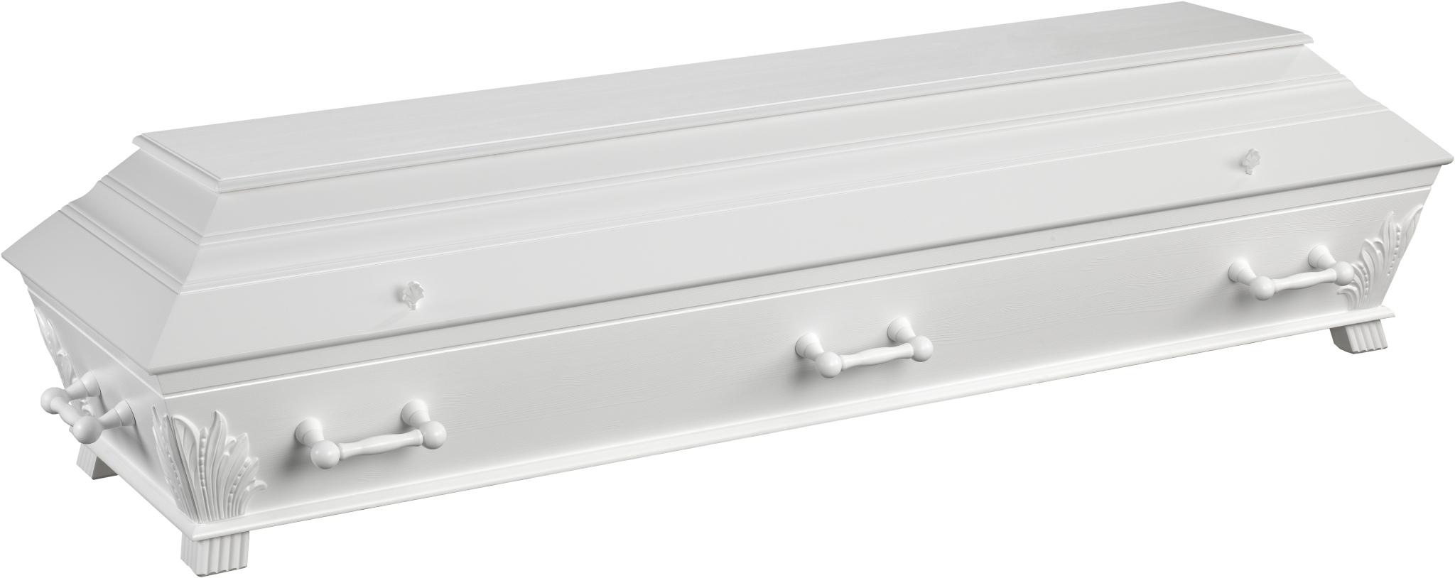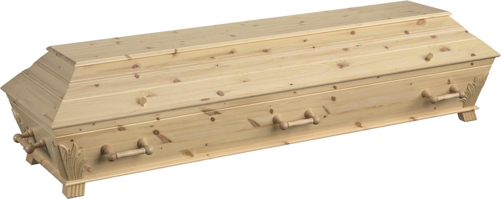 En påkostet kistemodell, produsert i furu. Modellen leveres med dreide trehåndtak og hjørneornamenter.