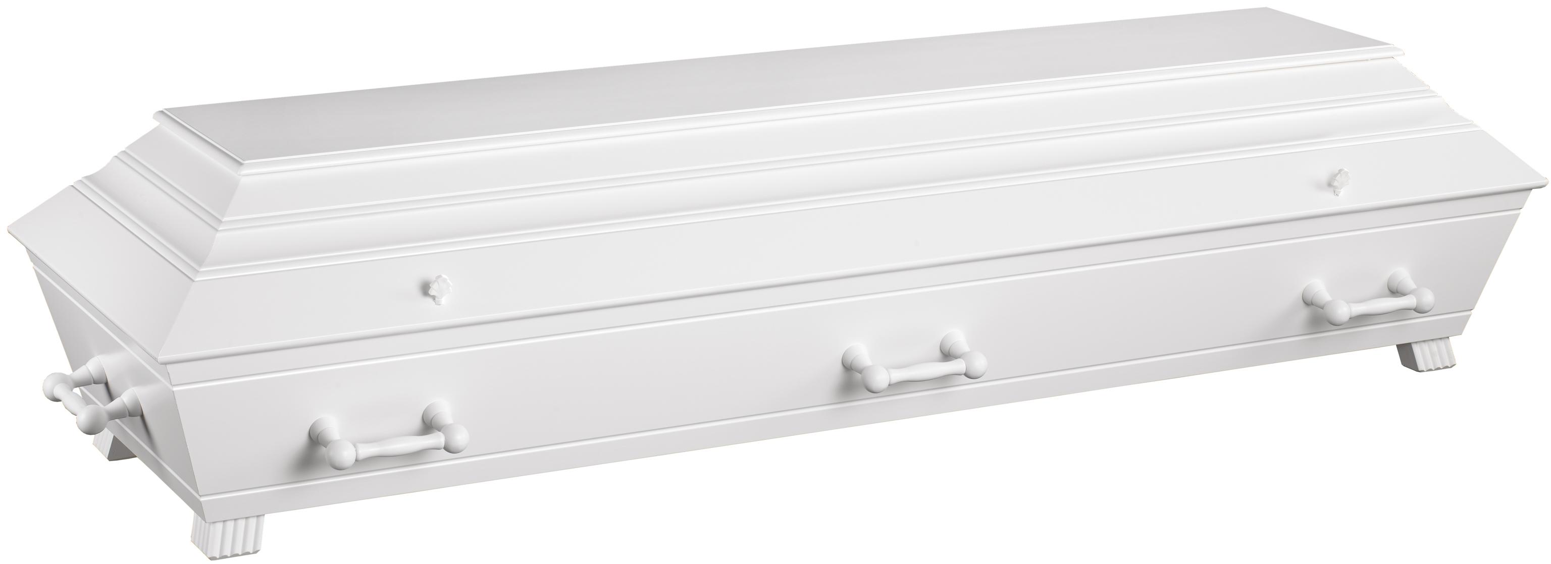 En tradisjonell, hvitlakkert furukiste, utstyrt med dreide trehåndtak. Topplate i furu.