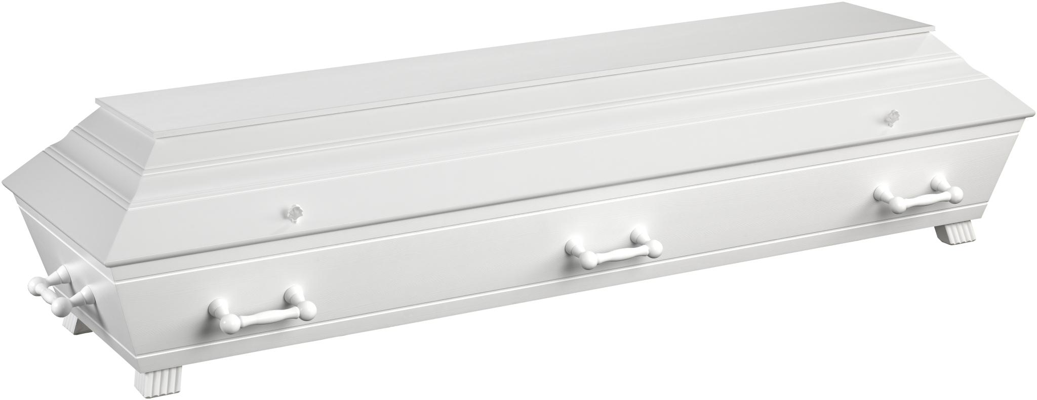 En tradisjonell, hvitlakkert furukiste, utstyrt med dreide trehåndtak. Topplate i fiber.